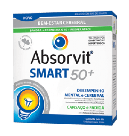 Use o cupão BEM-VINDO na primeira compra = 10% de desconto + oferta de portes Absorvit Smart 50+ 30 Ampolas, tónico cerebral. Além disso contém uma ação anti oxidante, indicado para o reforço das capacidades cognitivas, melhoria do rendimento intelectual e dificuldade de concentração e memorização. De forma que é um importante reforço para adultos a partir dos 50 anos.