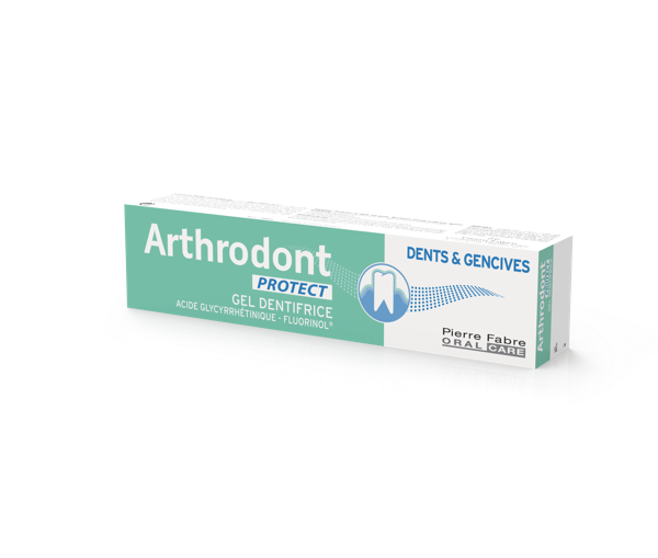 Arthrodont Protect contém Ácido Glicirretínico, um extrato de raiz de alcaçuz, com propriedades calmantes, e Fluorinol®, que ajuda a remineralizar o esmalte.