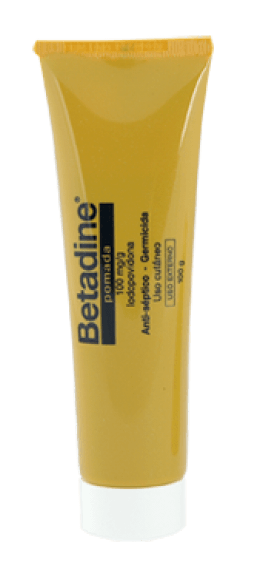 Poderá ver onde aplicou o Betadine. A zona castanha indica a parte da ferida que já foi desinfectada. Assim que a cor castanha desaparecer é necessário uma nova aplicação de Betadine. Desta forma, está sempre seguro de que a ferida está protegida contra os microorganismos. As crianças adoram um pouco de cor nas feridas!