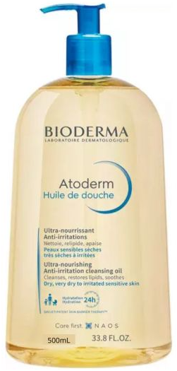 Atoderm Óleo de Duche acalma e protege contra agressões externas, graças à sua fórmula exclusiva composta por biolípidos vegetais, vitamina PP e Skin Barrier Therapy. Biolípidos vegetais acalmam a sensação de repuxamento, aumentam a resistência da pele, recriando o filme protetor da pele. A Vitamina PP, estimula a síntese lipidica, permite a reconstrução da barreira cutânea por um longo período. A patente Skin Barrier therapy™ impede biologicamente a ligação das bactérias (Staphylococcus aureus) responsáveis pelo agravamento da irritação da pele. O complexo natural patenteado DAF aumenta o limiar de tolerância da pele.