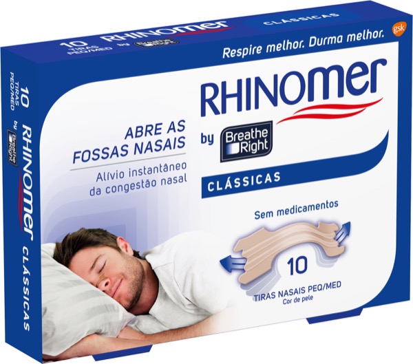 Tiras Nasais Rhinomer by Breathe Right. Abre as fossas nasais. Permite um alívio instantâneo da congestão nasal. Sem medicamentos. Ao abrirem as fossas nasais, as tiras nasais Rhinomer by Breathe Right melhoram o fluxo de ar, permitindo um alívio instantâneo da congestão nasal. As tiras nasais Rhinomer by Breathe Right não contêm medicamentos e está clinicamente comprovado que ao abrirem as fossas nasais permitem respirar 31% mais de ar. As tiras Rhinomer by Breathe Right são duas bandas plásticas flexíveis patenteadas. O adesivo especial permite que a tira se ajuste comodamente sobre as abas do nariz e a sua ação de flexão permite que as bandas elevem as fossas nasais abrindo e mantendo os canais nasais abertos. As tiras Rhinomer by Breathe Right podem ser usadas de dia ou à noite para o alívio de congestão nasal, devido a alergias, constipações, ressonar, ou desvio do septo, mas não devem ser usadas mais de 12h por dia.