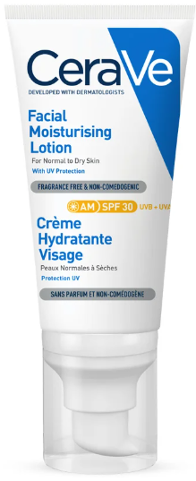 Desenvolvida com dermatologistas, 3 ceramidas essenciais e a exclusiva tecnologia MVE de hidratação encapsulada com libertação controlada e contínua de ingredientes ativos, a Loção Facial Hidratante SPF 30, para pele normal a seca, é formulada com Niacinamida, Ácido Hialurónico, Glicerina e Filtros Solares para ajudar a apaziguar e a hidratar ao mesmo tempo que protege a pele dos raios solares UVA e UVB. Este hidratante facial com proteção de alto espetro é de fácil aplicação e não deixa resíduos. Sem perfume, não comedogénico e hipoalergénico.