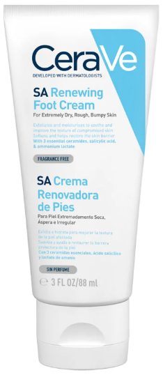 Desenvolvido com dermatologistas, 3 ceramidas essenciais e a exclusiva tecnologia MVE de hidratação encapsulada com libertação controlada e contínua de ingredientes ativos, o Creme Renovador de Pés, para pele extremamente seca, áspera e irregular, é formulado com Ácido Hialurónico, Ácido Salicílico, Niacinamida, Glicerina, Fitoesfingosina e Colesterol para hidratar, apaziguar, esfoliar, suavizar a pele e ajudar restaurar a barreira cutânea protetora dos pés. Adequado para pele gretada. Sem perfume e não comedogénico.
