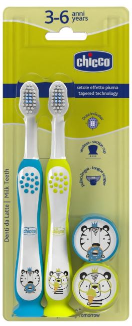 Cerdas cónicas muito macias, com pontas ultra finas, para uma ação delicada sobre o esmalte e as gengivas sensíveis. Cabeça com raspador de língua. Cerdas coloridas no centro das cabeças para indicar a dose correta de pasta de dentes a colocar. Pega ergonómica e antiderrapante. Com a sua divertida capa protetora de cerdas e a sua ventosa, escovar os dentes 3-6 tornar-se-á uma rotina agradável!