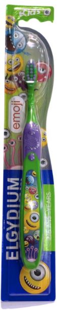 Elgydium Kids Emoji Idades 2 a 6, uma escova de dentes apelativa e divertida, desenvolvida para crianças.