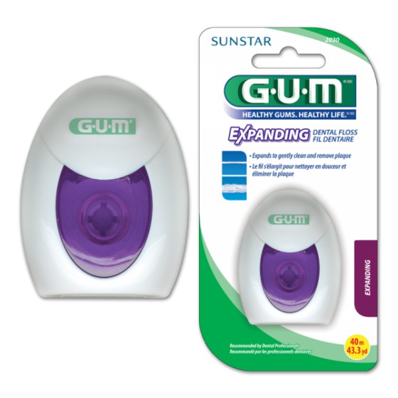 GUM EXPANDING FLOSS Fio Dentário é fino e fácil de inserir entre os dentes. Uma vez colocado, este fio expande-se significativamente. Isto permite que se encaixe facilmente em todos os espaços entre os dentes, alcançando uma maior superfície dentária e limpando eficazmente abaixo da linha da gengiva.