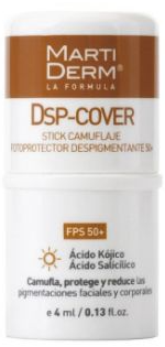O stick despigmentante DSP-Cover é um protetor solar que atua sobre as manchas. Com ácido kójico, que reduz as hiperpigmentações, e ácido salicílico, que favorece a renovação celular. Com efeito camuflagem, este cover stick despigmentante previne e dissimula as manchas.