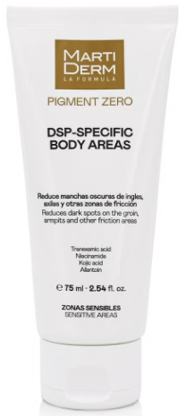 DSP-Specific Body Areas é um creme despigmentante corporal que clareia e unifica o tom de zonas sensíveis à fricção, como axilas e virilhas.