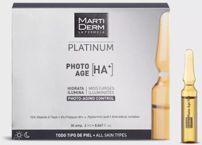 Photo Age HA+ é a ampola da MartiDerm fruto da sinergia entre a vitamina C, o Proteum 89+ e o ácido hialurónico. Trata-se de uma ampola de fácil absorção, que hidrata e ilumina a pele, além de suavizar o aspeto das rugas, proporcionando um rosto mais firme. Photo Age HA+ é uma ampola de absorção rápida que hidrata, ilumina e melhora o aspeto da pele. A sua fórmula com vitamina C-Tech, Proteum 89+ e ácido hialurónico previne e reduz os sinais de fotoenvelhecimento, como as rugas, as manchas e a perda de firmeza. Protege também a pele com o seu poderoso efeito antioxidante, defendendo-a das agressões diárias.