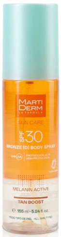 SPF 30 Bronze Body Spray é uma solução bifásica de absorção rápida. Fotoprotetor corporal que potencia e prolonga o bronzeado ativando as defesas naturais da pele para obter um resultado radiante e uniforme, graças ao ativo Melanin Active.