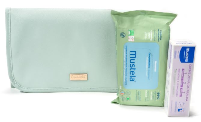 Dentro do Nécessaire Muda da Fralda encontra os produtos essenciais Mustela, formulados com ativos de origem natural para proteger e cuidar da pele delicada do bebé a cada troca: