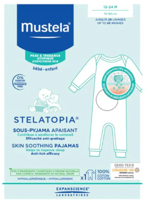 O pijama calmante cutâneo deve estar em contato direto com a pele, com as costuras externas expostas. Essas costuras externas ajudam a limitar o risco. Pode ser utilizado sozinho ou por baixo de outro pijama do bebé. Diariamente deve também aplicar um cuidado emoliente, como o Bálsamo Emoliente Stelatopia®. Lavar a 30°C. Eficácia comprovada até 20 lavagens.