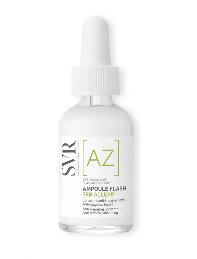 Para encontrar o melhor equilíbrio entre eficácia e tolerância, a SVR formulou este tratamento com 15% de ácido azelaico, um ativo dermatológico anti-inflamatório e queratolítico reconhecido. Combinado com ácido salicílico, zinco e niacinamida, SEBIACLEAR Ampoule AZ desobstrui a pele em profundidade e reduz visivelmente as imperfeições e vermelhidão em tempo recorde. A sua textura leitosa e fluida é muito rapidamente absorvida para um acabamento invisível. A pele fica limpa, purificada, suavizada e confortável.