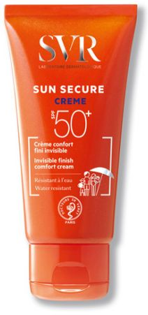 O protetor solar Sun Secure da marca SVR com proteção solar elevado SPF50+ é um creme conforto com uma textura confortável e invisível, de acabamento não gorduroso nem colante.