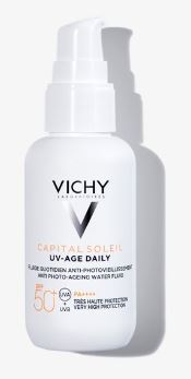 UV-AGE DAILY é um fluido da Vichy que combate o fotoenvelhecimento. A sua tecnologia Netlock multipatenteada forma uma película protetora ultrafina, ultrarresistente e invisível contra os UV, para uma proteção muito elevada contra os raios UVB e UVA, responsáveis por mais de 80% dos sinais de envelhecimento.