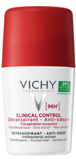 Vichy 96H Clinical Control Antitranspirante Antiodor reduz a transpiração excessiva para uma eficácia que dura 96 horas, proteção contra o suor e odor.