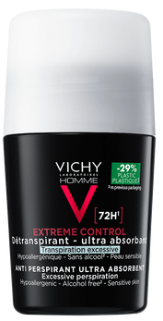 Desodorizante 72H Vichy Homme Extreme Control Antitranspirante proporciona um controlo duradouro do odor e do suor durante 72 horas, mesmo em caso de transpiração intensa. Testado sob controlo dermatológico, em pele sensível. Fórmula hipoalergénica. Sem álcool.