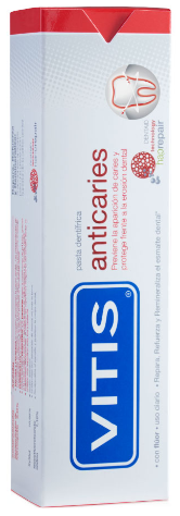 Use o cupão BEM-VINDO na primeira compra = 10% de desconto + oferta de portes VITIS Anticaries pasta dentífrica é um produto para a higiene oral de uso diário especialmente desenvolvida para prevenir as cáries a três níveis. Graças à sua tripla ação anticáries, repara, reforça e remineraliza o esmalte para uma maior prevenção da cárie dentária, protegendo também contra a erosão dentária.