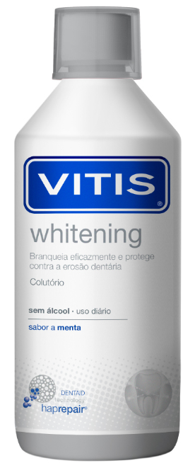 Use o cupão BEM-VINDO na primeira compra = 10% de desconto + oferta de portes VITIS Whitening colutório é um produto para a higiene oral que branqueia eficazmente os dentes, eliminando as manchas e prevenindo a sua formação, e recupera o branco natural e o brilho dos dentes. Além disso, não danifica o esmalte dentário.