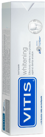A pasta dentífrica VITIS Whitening de uso diário tem uma formulação exclusiva que branqueia eficazmente os dentes, devolvendo-lhes o branco natural e o brilho sem danificar o esmalte dentário.